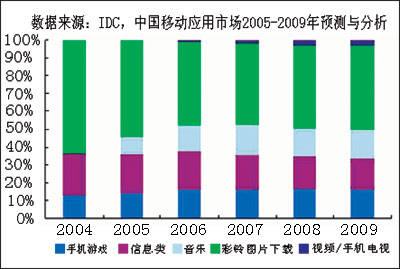 與彩鈴服務相比,圖片下載、彩信業(yè)務由于受到手機價格等因素的影響,近兩年的推廣不是很順利。IDC中國電信研究部經理級分析師王彥認為,隨著彩屏手機終端的體積和價格都有所下降,彩信業(yè)務在今后兩年將呈現一個較好的發(fā)展趨勢,IDC預測該業(yè)務的未來五年CAGR將達到12.5%。