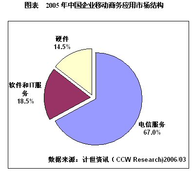 目前,我國移動(dòng)商務(wù)市場(chǎng)仍處于萌芽期,根據(jù)計(jì)世資訊(CCW Research)《2005-2006中國移動(dòng)商務(wù)應(yīng)用發(fā)展趨勢(shì)研究報(bào)告》數(shù)據(jù),2005年中國企業(yè)移動(dòng)商務(wù)應(yīng)用市場(chǎng)規(guī)模為112.5億元,其中硬件投資為16.3億元,軟件與IT服務(wù)投資為20.8億元,電信服務(wù)投資達(dá)到75.4億元,占有整體市場(chǎng)的67.0%。