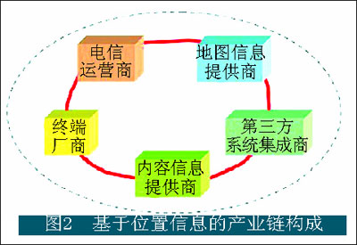 ,卻沒有一種業(yè)務(wù)被廣大人群使用。這是由于基于位置信息的業(yè)務(wù)需要取得大量的應(yīng)用層面相關(guān)的信息,進(jìn)而形成有特色的應(yīng)用;谖恢眯畔⒌臉I(yè)務(wù)和應(yīng)用涉及的角色比較多,所以為了有效地開展這類業(yè)務(wù),必須清晰地認(rèn)識(shí)其價(jià)值鏈的構(gòu)成,只有這樣,運(yùn)營(yíng)商才能有一個(gè)清晰的定位,內(nèi)容開發(fā)和提供商才能獲得事半功倍的結(jié)果,價(jià)值鏈才能健康地發(fā)展和成長(zhǎng)。從業(yè)務(wù)提供的角度,在基于位置信息的業(yè)務(wù)環(huán)境中其產(chǎn)業(yè)鏈的組成如圖2所示。