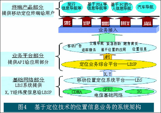 其中在基礎(chǔ)網(wǎng)絡(luò)層面中,LBS系統(tǒng)提供X、Y經(jīng)緯度信息,并把信息傳遞到定位業(yè)務(wù)綜合平臺(tái)。提供不同位置應(yīng)用的平臺(tái)部分通過接口的方式獲取位置信息,進(jìn)行面向特定業(yè)務(wù)的計(jì)算。終端用戶通過移動(dòng)終端并以不同的接入方式獲取位置類的信息服務(wù)。
