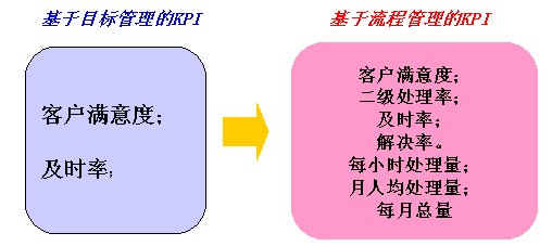 - 基于流程的指標(biāo)是一定可以在流程中可以測量到的,而基于目標(biāo)的KPI不一定。如:以前我們經(jīng)常提到的關(guān)于投訴處理的“一次處理率”指標(biāo),到目前為止,沒有人能解決其測量問題。因此,我們重新定義了可測量的替代指標(biāo)(一級(jí)處理率、二級(jí)處理率和三級(jí)處理率:一級(jí)處理率指由前臺(tái)話務(wù)人員直接處理的投訴占整個(gè)投訴量的比率;二級(jí)處理率指由前臺(tái)客服中心后臺(tái)人員處理的投訴占整個(gè)投訴量的比率;三級(jí)處理率指由市公司投訴處理人員處理的投訴占整個(gè)投訴量的比率)。
