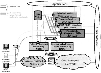 R6中的相關規(guī)范,但要求支持更多的接入方式,包括xDSL、WLAN、LAN、MAN等。此外,還定義了網絡附著子系統和資源準入控制子系統(RACS)。在這樣的框架下,NGN可以實現基于SIP的業(yè)務、基于SIP-I協議傳統業(yè)務以及基于RTSP的業(yè)務等。ETSI