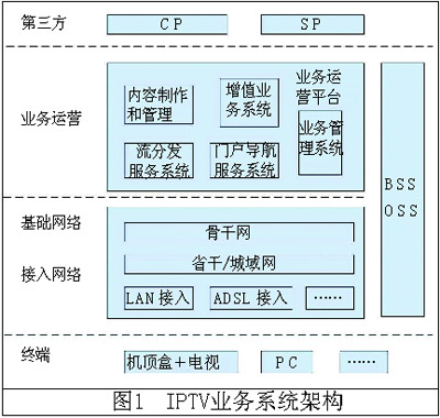 IPTV業(yè)務系統(tǒng)架構(gòu)可分為四層: 第三方業(yè)務提供者如CP和SP、業(yè)務運營層、網(wǎng)絡(luò)承載層和用戶終端層(如圖1)。