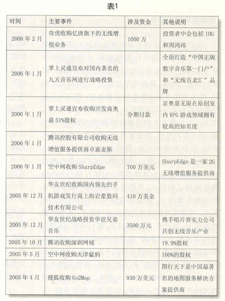 從2003年開始,國內(nèi)就顯現(xiàn)出并購增值服務(wù)運營企業(yè)的苗頭。2004年以來,隨著整治增值服務(wù)運營企業(yè)的力度不斷加大,并購漸成風(fēng)潮(見表1)。2004年2月,新浪收購深圳網(wǎng)興科技公司;2004年5月,搜狐收購手機WAP服務(wù)提供商北京吉菲爾公司。2005年,在“超級女生”節(jié)目大獲成功后,掌上靈通宣布將對國內(nèi)著名的九天音樂網(wǎng)進(jìn)行戰(zhàn)略投資,全面打造“中國正版數(shù)字音樂第一門戶”和“無線百老匯”品牌。各大移動增值業(yè)務(wù)服務(wù)商通過并購競爭對手,門戶網(wǎng)站可以在移動增值服務(wù)領(lǐng)域?qū)で笮碌耐黄,獲得可觀的利益,增強自身的競爭力。伴隨著3G商用的日益臨近和市場競爭的不斷加劇,主流SP(服務(wù)提供商)進(jìn)一步加快了資本購并和業(yè)務(wù)整合的步伐,整個SP行業(yè)將加速洗牌。經(jīng)過市場整合,主流SP將不斷做大做強,而相當(dāng)多的缺乏市場競爭力的SP將被淘汰出局。