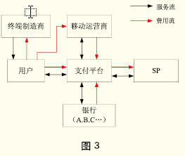 該模式中,第三方支付服務(wù)提供商是獨立于銀行和移動運營商之外的經(jīng)濟實體,其自己拓展用戶,與銀行及移動運營商協(xié)商合作,提供手機支付業(yè)務(wù),見圖3。