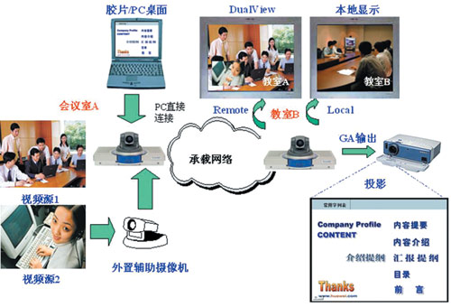 會(huì)議中常常需要同時(shí)傳送演講人的演講膠片和演講人的圖像,這套視訊系統(tǒng)非常方便地支持此功能,只需要把演講人的便攜機(jī)用線纜接到會(huì)場的終端上,通過終端的SXGA輸入功能可方便地將膠片信息發(fā)送到遠(yuǎn)端會(huì)場,遠(yuǎn)端會(huì)場通過終端的SXGA輸出接口將膠片內(nèi)容通過投影設(shè)備顯示出來,而終端的主視頻輸出接口顯示的是遠(yuǎn)端演講人的圖像。