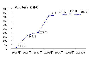 經(jīng)過6年多的運(yùn)營(yíng),韓國(guó)電信的eBilling業(yè)務(wù)發(fā)展良好,目前與其合作的ICP已達(dá)到500多家,內(nèi)容涵蓋了收費(fèi)郵箱、在線軟件銷售、聊天、娛樂、游戲、漫畫、綜合信息等;業(yè)務(wù)收入也逐年上升,從2000年的14.1億韓元(折合人民幣0.11億元)增長(zhǎng)到2006年9月份的424.2億韓元(折合人民幣3.3億元),如圖2、圖3所示。