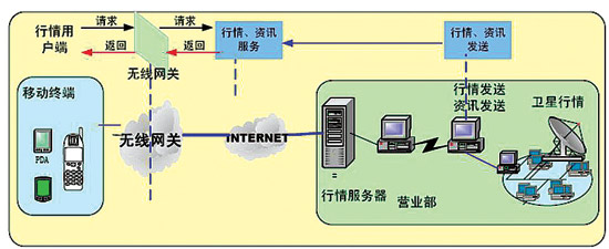 3.移動證券應(yīng)用行情/委托平臺。移動證券應(yīng)用行情/委托平臺可以完全利用券商原有的行情主站與委托主站的現(xiàn)有資源,在移動終端客戶端通過中國移動的GPRS網(wǎng)絡(luò)發(fā)起登錄請求后,采用與網(wǎng)上交易相同的通信協(xié)議與加密協(xié)議,直接聯(lián)入券商現(xiàn)有的行情主站與委托主站,獲取行情,并實(shí)現(xiàn)交易。券商現(xiàn)有的行情主站和委托主站無需做任何升級與改動。