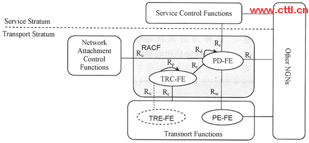 RACF由策略決策功能實體PD-FE和傳送資源控制功能TRC-FE兩個功能實體組成。PD-FE基于網(wǎng)絡(luò)策略規(guī)則、業(yè)務(wù)控制功能SCF提供的業(yè)務(wù)信息、網(wǎng)絡(luò)附著控制功能NACF提供的傳送層簽約信息,以及TRC-FE提供的資源接納決策結(jié)果,做出網(wǎng)絡(luò)資源接納控制的最后決策?梢曰诿總流對傳送層的策略執(zhí)行功能實體。PE-FE下發(fā)資源接納控制策略。TRC-FE負責(zé)收集和維護傳送網(wǎng)的拓撲和資源狀態(tài)信息,基于拓撲、連接性、網(wǎng)絡(luò)、節(jié)點資源的可用性以及接入網(wǎng)中的傳送層簽約信息等網(wǎng)絡(luò)信息控制資源的使用,提供傳送網(wǎng)絡(luò)接納控制的決策。PD-FE通過Rt參考點請求TRC-FE檢測或者決定所請求的媒體流路徑上的QoS資源。