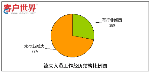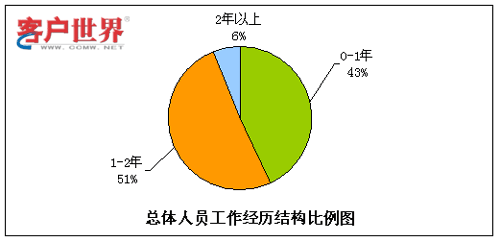 呼叫中心由于高壓力、24小時輪班等工作特性,有相當比例的流失是因為不適應工作環(huán)境而導致的,其中一個主要原因就是新入職員工想象中的工作環(huán)境和現(xiàn)實情況大相徑庭。而有呼叫中心工作經(jīng)驗的員工對于這點的適應性相對較強,因此我們對呼叫中心員工是否有行業(yè)經(jīng)歷方面的情況進行了統(tǒng)計分析。