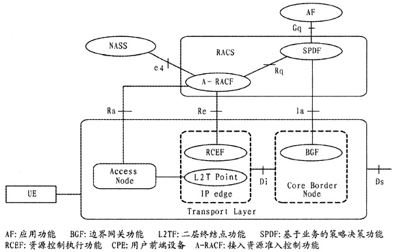 RACS是NGN的組成部分之一,將業(yè)務(wù)層的資源需求與網(wǎng)絡(luò)承載層的資源分配相關(guān)聯(lián),主要完成策略控制、資源預(yù)留、接納控制、網(wǎng)絡(luò)地址轉(zhuǎn)換(NAT)和防火墻穿越等功能。RACS通過(guò)一系列策略為應(yīng)用提供基于傳輸?shù)目刂品⻊?wù),只要該應(yīng)用支持RACS接口,RACS就能保證任意應(yīng)用能夠請(qǐng)求到與其服務(wù)相匹配的傳輸資源。同時(shí),RACS為運(yùn)營(yíng)商提供多種不同接納控制的方法,并設(shè)置各自的承載服務(wù)策略。RACS為各種服務(wù)提供獲得網(wǎng)絡(luò)資源的方法,使得用戶終端可以獲得所提供服務(wù),其總體功能結(jié)構(gòu)如圖3所示[5]。