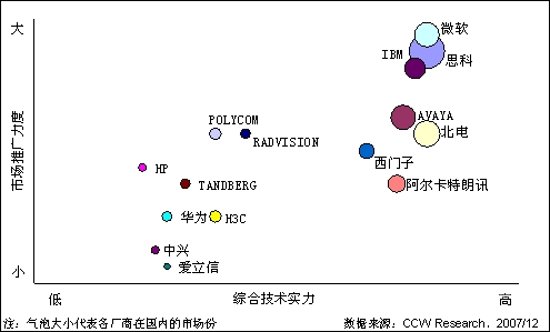 市場(chǎng)競(jìng)爭(zhēng)非常激烈,但還沒(méi)有一個(gè)廠商占據(jù)對(duì)優(yōu)勢(shì)。目前統(tǒng)一通信市場(chǎng)形成了兩類供應(yīng)商的競(jìng)爭(zhēng):電信網(wǎng)絡(luò)設(shè)備廠商(如思科、北電)和軟件廠商(如微軟、IBM)。電信設(shè)備廠商的優(yōu)勢(shì)集中在硬件產(chǎn)品上,比如路由器、VoIP網(wǎng)關(guān)產(chǎn)品、軟交換設(shè)備;而軟件廠商,像微軟、IBM的優(yōu)勢(shì)在于其在電腦桌面上的絕對(duì)統(tǒng)治力,幾乎所有的統(tǒng)一通信企業(yè)都需要和微軟、IBM進(jìn)行合作。但從現(xiàn)在的發(fā)展?fàn)顩r來(lái)看,各類廠商之間既有競(jìng)爭(zhēng)又有合作,但還沒(méi)有一個(gè)廠商占據(jù)對(duì)優(yōu)勢(shì)。