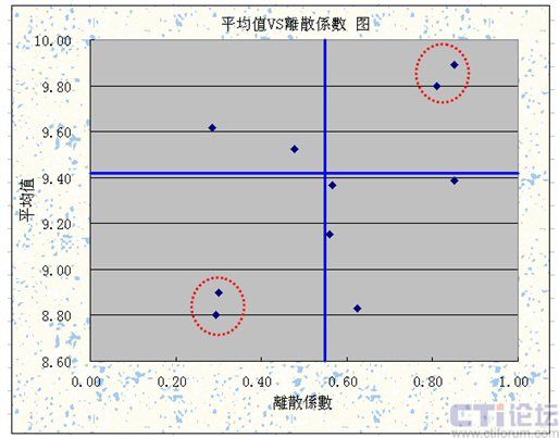 利用散點圖很容易找出我們的內部標竿,例如下面這張圖是每個班組小休率在12月份的平均值和離散系數,可以清楚的看到,這四個象線的左下角,有兩個班組的小休率的平均值低于9以下,有一個班組甚至在8.8左右,這兩個班組不只是平均值最低,而且在12月份每一天的小休率也是控管的最好,差異是最小的。