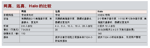 惠普的Halo工作室系統(tǒng)強(qiáng)調(diào)可用于企業(yè)遠(yuǎn)程模擬面對面業(yè)務(wù)會(huì)議。通過Halo連接,每個(gè)Halo工作室可支持會(huì)議桌前排六人,第二排三至六人,最多12人的會(huì)議規(guī)模。每個(gè)工作室有三臺(tái)等離子顯示器,參會(huì)人員能夠看到與本人同樣大小的圖像。另外,參會(huì)者還可使用一個(gè)安裝在等離子顯示器上方的50英寸的協(xié)作屏幕,與其他Halo工作室中的人員共享其筆記本電腦中的文件與數(shù)據(jù)。工作室還包括一個(gè)高清圖文攝像機(jī),可用于拍攝桌上的物品并顯示在協(xié)作顯示器上,真實(shí)呈現(xiàn)色彩、陰影與細(xì)微之處。同時(shí)配備的電話讓與會(huì)者可以與Halo工作室外的人員聯(lián)系。工作室配備了廣播質(zhì)量的音頻與照明設(shè)施,參會(huì)者可以使用屏幕上簡便的用戶界面,通過點(diǎn)擊鼠標(biāo)開始協(xié)作。一個(gè)復(fù)雜的軟件控制系統(tǒng)將確保各個(gè)Halo工作室輕松、無縫地協(xié)同工作。