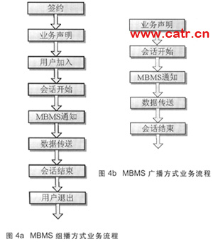 MBMS可應用組播模式和廣播模式兩種業(yè)務模式。廣播模式接近于數(shù)字電視業(yè)務,而組播模式專注和定位于群業(yè)務。組播模式提供了更好的計費特性,包括服務訂閱、接入和推出功能,需要用戶簽約相應組播組,進行業(yè)務激活,并產(chǎn)生相應的計費信息,而廣播業(yè)務不需要小區(qū)中所有用戶都制定該業(yè)務便可以獲得。由于組播和廣播模式在業(yè)務需求上存在不同,導致其業(yè)務流程也不同(見圖4a、圖4b)。