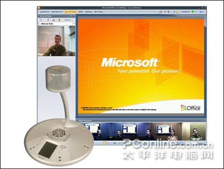 微軟Office RoundTable,音頻-視頻協(xié)作設(shè)備,帶有一個獨特的 360 度相機(jī)。在結(jié)合 Office Communications Server 2007 使用時,RoundTable 還可交付卓越的會議體驗:將會議環(huán)境擴(kuò)展到多個位置,F(xiàn)場及遠(yuǎn)程位置的與會人員可以全景查看會議室中的每位成員,還可以在輪流發(fā)言時拉近特寫某個與會者。