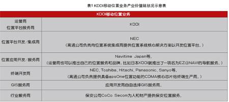 以日本KDDI為例,移動(dòng)位置業(yè)務(wù)的產(chǎn)業(yè)價(jià)值鏈狀況如表1所示。