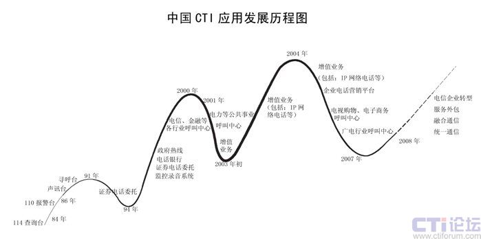 CTI在中國已經(jīng)發(fā)展了二十多年,已經(jīng)從最早的電信行業(yè)CTI應(yīng)用發(fā)展到金融(包括銀行、保險、證劵及基金)、電力、郵政、企業(yè)(包括煙草、汽車、家電、IT、互聯(lián)網(wǎng)、旅游、報業(yè)、航空、物流、醫(yī)療、公共事業(yè)等)、政府、軍隊等各行各業(yè)的應(yīng)用。特別在1995年到2001時期,是CTI應(yīng)用發(fā)展最快,普及面最廣的時期,也是CTI市場進入了第二次高潮;從2002開始增值業(yè)務(wù)是整個CTI行業(yè)的突破口,整個行業(yè)以增值業(yè)務(wù)為主,CTI市場進入了第三次高潮;從2006年開始,增值業(yè)務(wù)進入了衰退期,整個CTI行業(yè)市場出現(xiàn)了嚴重的危機,加上新的技術(shù)出現(xiàn),技術(shù)的換代,對原來的傳統(tǒng)語音產(chǎn)品和公司是個致命的打擊。