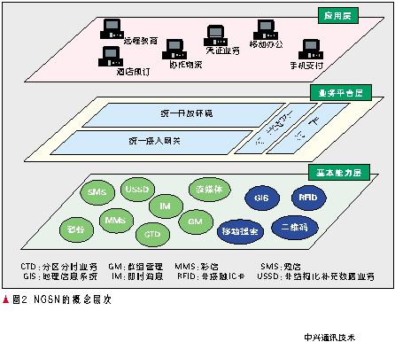 NGSN是為了適應(yīng)網(wǎng)絡(luò)和技術(shù)的融合趨勢(shì)、運(yùn)營(yíng)商轉(zhuǎn)型的需求提出的,通過(guò)整合各種網(wǎng)絡(luò)業(yè)務(wù)能力,實(shí)現(xiàn)數(shù)據(jù)、業(yè)務(wù)、能力和管理的統(tǒng)一,從而能夠快速提供各種增值業(yè)務(wù)、協(xié)助運(yùn)營(yíng)商在價(jià)值鏈中處于主導(dǎo)地位。其概念層次如圖2所示。