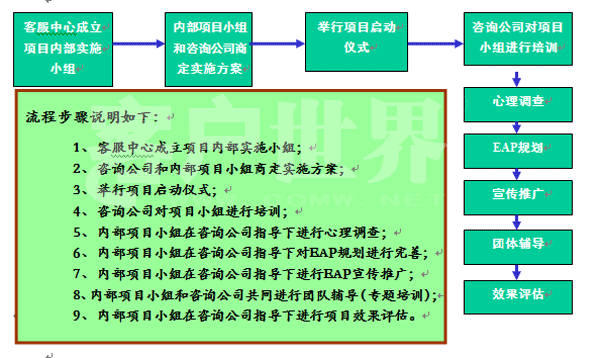 另外,在客服中心EAP項目實施的基礎上,中國移動江蘇公司正在準備搭建全省的EAP項目平臺,通過熱線服務、培訓咨詢、講座推廣、社會活動等形式在全省搭建一個員工壓力釋放的平臺。