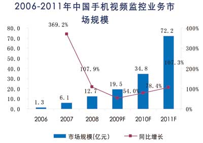 根據(jù)諾達咨詢《手機視頻監(jiān)控市場及用戶行為研究報告2009》研究結(jié)果,2006-2009年為手機監(jiān)控業(yè)務導入期,2006年手機監(jiān)控業(yè)務市場規(guī)模達到1.3億人民幣,手機監(jiān)控業(yè)務的年運營費用自2009年開始,將會逐步下降,目前平均約1000元/年,至2011年將逐步下降到600元/年,設(shè)備費用也將由目前的3000元/點,逐步下降到2011年的1000元/點。