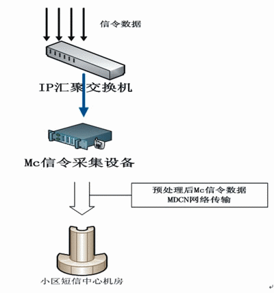 在軟交換模式下,在不影響信令傳輸?shù)那疤嵯拢^(qū)短信系統(tǒng)通過對(duì)Mc接口(MGW與MSCServer之間)進(jìn)行IP數(shù)據(jù)采集,替代采集A接口七號(hào)信令數(shù)據(jù),對(duì)采集到的Mc接口數(shù)據(jù)進(jìn)行分析、合成,獲取到小區(qū)短信平臺(tái)所需的重要、關(guān)鍵數(shù)據(jù)。
