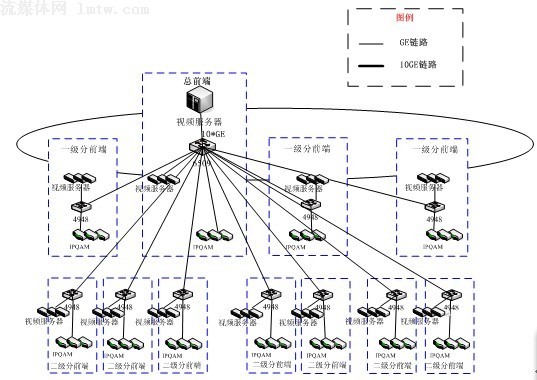 方案二:全集中式。在總前端集中部署若干臺(tái)視頻服務(wù)器,通過(guò)萬(wàn)兆網(wǎng)絡(luò)直接向各分前端提供視頻流服務(wù);示意圖如下: