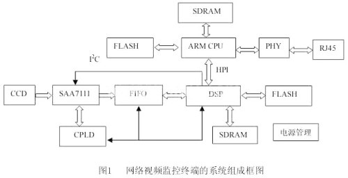 為實(shí)現(xiàn)視頻實(shí)時檢測以及網(wǎng)絡(luò)傳輸功能,本監(jiān)控終端采用ARM+DSP的體系框架,系統(tǒng)組成如圖1所示,主要包括以ARM S3C4510B為核心的主控兼網(wǎng)絡(luò)傳輸模塊,以SAA7111為核心的視頻采集模塊,以DSP
