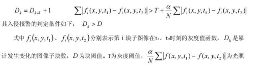 敏感項(xiàng),α為抑制系數(shù),N為檢測區(qū)域內(nèi)的像素數(shù)目。采用這種塊比較法,閾值取值范圍大大減小,易于確定,而且對運(yùn)動目標(biāo)的大小也有一定的選擇性。在檢測每一子塊圖像是否發(fā)生變化時,引入光照敏感項(xiàng),避免了因光照變化引起的虛警。這種方法對光線變化有一定的自適應(yīng)性,擴(kuò)展了系統(tǒng)的動態(tài)適用范圍。