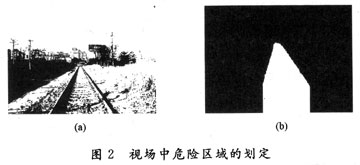 圖像二值化后的結果如圖2(a)所示,得到的最終結果如圖2(b)所示。從兩幅圖像的對比可以看出,圖像經(jīng)過一系列處理后,基本標定了危險區(qū)域。對于得到的圖2(b),圖中白色的區(qū)域為鐵道雙軌內(nèi)部即設定的危險區(qū)域。應用此種方法得到的結果圖像在光照條件充足情況下能夠得到更好的效果,不適用于光照條件不足和夜間的危險區(qū)域標定。
