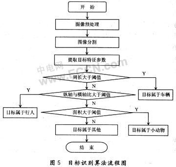 根據(jù)運動目標的分類可知,車輛的周長是最長的,所以首先直接判斷圖像中運動目標的周長,如果大于某一設定好的閾值,則可輕易判斷出視場中目標屬于車輛。余下的目標中,行人比小動物的縱橫軸比值大,設定縱橫軸比閾值,據(jù)此可以判斷出目標屬于行人。最后將設定一個面積閾值,面積大于此閾值則可判斷目標屬于小動物,否則目標屬于其他一些環(huán)境的干擾。