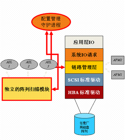 該技術(shù)的特點(diǎn)是通過(guò)主機(jī)層軟件方式建立存儲(chǔ)管理虛擬層,利用專(zhuān)業(yè)的第三方鏈路管理軟件解決磁盤(pán)陣列和主機(jī)的連通兼容性。其運(yùn)行依靠工作在存儲(chǔ)網(wǎng)絡(luò)鏈路管理層的軟件程序來(lái)完成,其體系架構(gòu)圖如下: