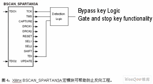 平臺中, 可在設計中使用BSCAN_SPARTAN3A宏模塊,其檢測邏輯可監(jiān)控FPGA構造中的JTAG控制信號,如圖4所示。如果檢測到JTAG控制信號的活動,用戶在設計可以立即繞過關鍵邏輯或關斷關鍵功能,不再執(zhí)行正確的功能。這樣反向工程人員讀到的將是不正確的功能模塊,在不能完成預期功能的解決方案上浪費時間和資源。