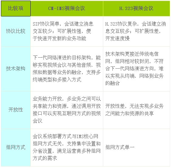 表1 CM-IMS視頻會議和傳統的H.323視頻會議比較