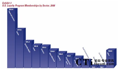 在美國,忠誠度營銷應(yīng)該用為廣泛的五個行業(yè)/領(lǐng)域是金融服務(wù)(銀行、保險、證券、基金等)、航空、專門零售(例如各類的專賣店、品牌連鎖)、酒店及百貨。值得一提的是,近兩年來,金融服務(wù)行業(yè)在忠誠度營銷的應(yīng)用發(fā)展迅速,各類忠誠度計劃的參與人數(shù)由2006年的2.388億上升到2008年的4.22億,這個增長主要是由各類具備信用卡、借記卡功能的聯(lián)名卡發(fā)行所致。