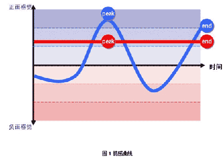 諾貝爾獎得主心理學(xué)家Daniel Kahneman發(fā)現(xiàn)人們在一次體驗中只會記住兩件事:峰值感受(流程中最好或最差的一點(diǎn))以及終了感受。我運(yùn)用“峰值——終了規(guī)則”將每個子流程上的情感感受按照自然時間順序連成一根“情感”曲線,如圖1所示。