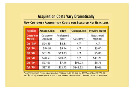 上世紀(jì)90年代末期DOT.COM就遭遇了這一嚴(yán)峻問題。70% - 80%的客戶在沒有完成采購之前就棄網(wǎng)站而去。對于許多人來說這被認(rèn)為是一個(gè)“行業(yè)基準(zhǔn)”,屬于可接受水平,但也有些人開始尋找解決方案。整個(gè)行業(yè)開始注意到分析家們的忠告:這一水平的放棄率是不被允許的。下面這張由Yankee集團(tuán)在2000年發(fā)布的表格向我們展示了電子商務(wù)企業(yè)客戶獲取成本螺旋形盤升的過程。