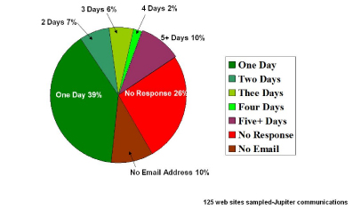 該報(bào)告進(jìn)一步總結(jié)到,60%的網(wǎng)站客戶希望更多互動(dòng)但許多電子商務(wù)企業(yè)無法回應(yīng)電子郵件且不能提供足夠的電話支持。也有很多電子商務(wù)企業(yè)提供電子郵件支持,比如說etoys,但對于如潮水般洶涌而來的電子郵件聯(lián)絡(luò)他們顯然沒有什么準(zhǔn)備以至于處理結(jié)果符合客戶預(yù)期的郵件少之又少。如果處理的好