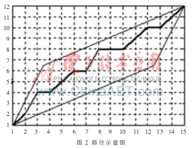 把測(cè)試模版的各個(gè)幀號(hào)n=1,…,N在一個(gè)二維直角坐標(biāo)系的橫軸上標(biāo)出,把參考模版的各幀號(hào)m=1,…,M在縱軸上標(biāo)出,通過(guò)這些表示幀號(hào)的整數(shù)坐標(biāo)畫(huà)出的橫縱線即可形成一個(gè)網(wǎng)格,網(wǎng)格中的每一個(gè)交叉點(diǎn)(n,m)表示測(cè)試模版中某一幀與訓(xùn)練模版中某一幀的交叉點(diǎn)。動(dòng)態(tài)規(guī)劃算法可以歸結(jié)為尋找一條通過(guò)此網(wǎng)格中若干格點(diǎn)的路徑,路徑通過(guò)的格點(diǎn)即為測(cè)試和參考模版中距離計(jì)算的幀號(hào)。