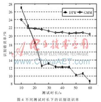 圖4給出基于DTW識(shí)別方法與GMM模型(混元數(shù)64)識(shí)別G.729編碼方案863語(yǔ)料庫(kù)的文本相關(guān)說(shuō)話(huà)人的誤識(shí)率對(duì)比圖。橫坐標(biāo)代表的測(cè)試語(yǔ)音的時(shí)長(zhǎng),縱坐標(biāo)代表識(shí)別誤識(shí)率。由實(shí)驗(yàn)結(jié)果可知在文本相關(guān)的說(shuō)話(huà)人識(shí)別中,基于DTW算法的識(shí)別率在絕大多數(shù)情況下高于GMM模型,且隨著測(cè)試語(yǔ)音的增長(zhǎng),優(yōu)勢(shì)更明顯。