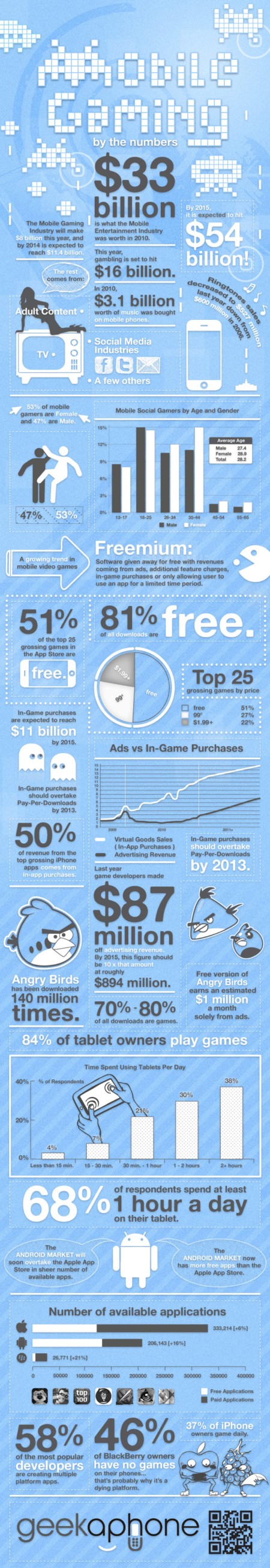 隨著移動互聯(lián)網(wǎng)浪潮的興起,大家玩游戲的平臺逐漸從傳統(tǒng)的游戲機(jī),PC,TV向新興的智能手機(jī)和平板電腦等移動終端遷移。PC時代的游戲巨頭EA,育碧等公司的光芒不再,PopCap,Rovio和Zynga等新興游戲公司出品的游戲則吸引著越來越多的玩家。照目前強(qiáng)勁的發(fā)展趨勢來看,移動游戲在未來將取得像PC游戲現(xiàn)在的地位,成為游戲市場的主力。關(guān)注移動終端發(fā)展的博客Geekaphone制作了下面這張超大信息圖,用詳細(xì)的統(tǒng)計(jì)數(shù)字展示了移動游戲發(fā)展的強(qiáng)勁趨勢。