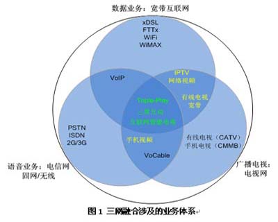 這種沖擊表現(xiàn)在信息通信領(lǐng)域的“時(shí)移事易”上,一個(gè)是在時(shí)間維度上,一個(gè)是在影響產(chǎn)業(yè)發(fā)展重大事件的維度上。其長(zhǎng)期累積的結(jié)果是,當(dāng)前全球范圍內(nèi)影響最大、最深遠(yuǎn)的莫過(guò)于寬帶網(wǎng)絡(luò)成為國(guó)家的信息化基礎(chǔ)設(shè)施。寬帶的普及深刻的影響和推動(dòng)了以TCP/IP為技術(shù)基礎(chǔ)的“三重播放”和在市場(chǎng)競(jìng)爭(zhēng)層面的“多重捆綁”業(yè)務(wù)營(yíng)銷(xiāo)策略,這構(gòu)成了三網(wǎng)融合最基本的內(nèi)容,隨之帶動(dòng)了近年已成為業(yè)界關(guān)注焦點(diǎn)的視頻業(yè)務(wù)向“一云三網(wǎng)多屏”的方向發(fā)展?傊录夹g(shù)和新產(chǎn)業(yè)發(fā)展導(dǎo)致傳統(tǒng)的電信業(yè)和廣播電視業(yè)從封閉逐步走向開(kāi)放,渠道、內(nèi)容、消費(fèi)者偏好均從單一走向多元;對(duì)消費(fèi)者而言,信息的流動(dòng)從單向變?yōu)殡p向和多向,新媒體、全媒體、自媒體在社會(huì)上的份量快速上升。 而來(lái)自市場(chǎng)的需求變化是:過(guò)去那種內(nèi)容和服務(wù)緊密捆綁于網(wǎng)絡(luò)的業(yè)務(wù)模式被開(kāi)放的互聯(lián)網(wǎng)沖擊得疲于招架,網(wǎng)絡(luò)和渠道的地位不斷下降,處于底層的網(wǎng)絡(luò)整合開(kāi)始朝著契合于上層內(nèi)容和應(yīng)用整合的方向發(fā)展;內(nèi)容和應(yīng)用成為產(chǎn)業(yè)發(fā)展的新重心,傳統(tǒng)運(yùn)營(yíng)商在挖潛增效做好“智能管道”的同時(shí),也希望借助三網(wǎng)融合躋身綜合信息服務(wù)領(lǐng)域。表現(xiàn)在網(wǎng)絡(luò)層面,傳統(tǒng)的電信業(yè)務(wù)大范圍地向?qū)拵P網(wǎng)上遷移;傳統(tǒng)的有線(xiàn)電視網(wǎng)進(jìn)軍新媒體,“電信化”色彩越來(lái)越強(qiáng)。在業(yè)務(wù)層面,如下圖示所,典型的融合業(yè)務(wù)如有線(xiàn)寬帶、IPTV、VoIP、手機(jī)視頻、互聯(lián)網(wǎng)智能電視等成為雙方競(jìng)爭(zhēng)的主陣地。
