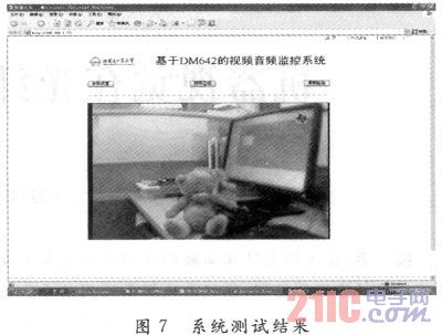 在集成開發(fā)環(huán)境CCS(C6000)下,加載相關(guān)驅(qū)動程序,對本系統(tǒng)進行了測試。CCD攝像頭為標(biāo)準(zhǔn)PAL制式,圖像采集的幀頻為25幀/s,圖像的分辨率為720×576像素。測試結(jié)果如圖7所示。測試結(jié)果表明,網(wǎng)絡(luò)連接正常,用戶在PC端可通過瀏覽器訪問系統(tǒng),成功實現(xiàn)遠程監(jiān)控。