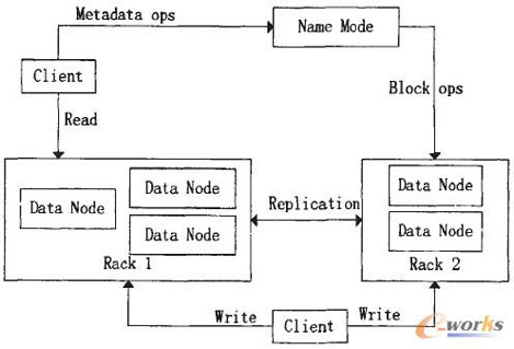 在云端,本系統(tǒng)采用開源框架Hadoop 0.20.2來實現(xiàn)。該框架主要提供Hadoop分布式文件系統(tǒng)(HDFS)和Map Reduce。其中HDFS為分布式計算存儲提供了底層支持,圖2是HDFS的結(jié)構(gòu)示意圖:
