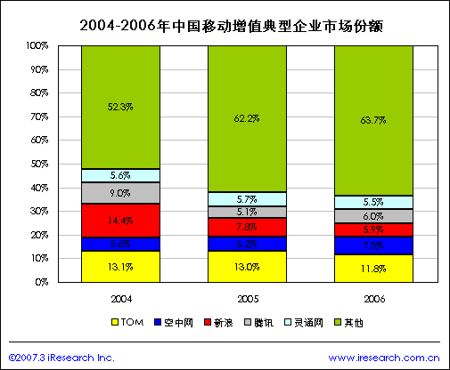 iResearch艾瑞市場(chǎng)咨詢最新的研究成果顯示,2004-2006年,在中國的移動(dòng)增值市場(chǎng)中,TOM、新浪的市場(chǎng)份額處于不斷下降的趨勢(shì),其中下降最明顯的是新浪網(wǎng),它的市場(chǎng)份額已由2004年的14.4%下降到2006年的5.9%,但與此同時(shí)空中網(wǎng)的市場(chǎng)份額卻處于增長趨勢(shì),已由2004年的5.6%增長到2006年的7.3%.