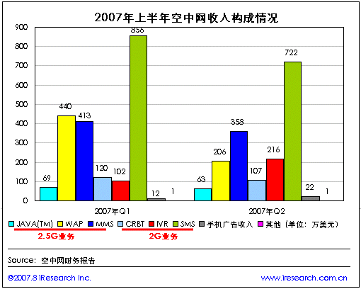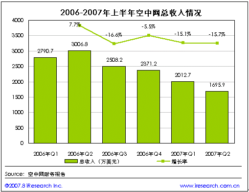 空中網(wǎng)2007年第二季度財報數(shù)據(jù)顯示,第二季度空中網(wǎng)的總收入1695.9萬美元,同比負增長43.6%,環(huán)比負增長15.7%。與第一季度相比在空中網(wǎng)兩個產品平臺的主要2G業(yè)務和2.5G的業(yè)務收入都出現(xiàn)了不同程度的下降,但2G業(yè)務中的IVR業(yè)務收入則出現(xiàn)了大幅上升。