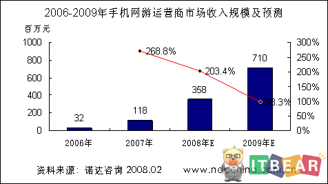 諾達(dá)咨詢報(bào)告《2008手機(jī)網(wǎng)游報(bào)告—產(chǎn)業(yè)發(fā)展與競(jìng)爭(zhēng)策略》認(rèn)為,手機(jī)網(wǎng)絡(luò)游戲已經(jīng)過了市場(chǎng)導(dǎo)入期,在未來幾年將步入快速發(fā)展階段。咨詢研究數(shù)據(jù)表明,2007年手機(jī)網(wǎng)游市場(chǎng)運(yùn)營收入達(dá)到了1.18億元人民幣,今年將達(dá)3.58億元人民幣,到2009年市場(chǎng)規(guī)模有望突破7.0億元人民幣。