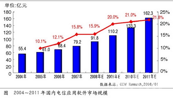 3G是中國未來通信建設(shè)的重點(diǎn)。隨著3G發(fā)展趨勢逐漸明朗化,為了有效地對3G網(wǎng)絡(luò)進(jìn)行支撐和管理,針對3G業(yè)務(wù)的IT系統(tǒng)建設(shè)也逐漸成為運(yùn)營商信息化的重點(diǎn)建設(shè)項(xiàng)目。BSS、OSS和MSS將成為這次建設(shè)的主要方向,今后相當(dāng)長的一段時間內(nèi),計(jì)費(fèi)賬務(wù)系統(tǒng)、經(jīng)營分析與決策系統(tǒng)、網(wǎng)絡(luò)資源管理系統(tǒng)、客戶關(guān)系管理系統(tǒng)等將成為國內(nèi)電信運(yùn)營商建設(shè)或規(guī)劃的重點(diǎn)。根據(jù)計(jì)世資訊調(diào)查顯示,2007~2011年,在3G建設(shè)全面展開后,電信應(yīng)用軟件市場的市場規(guī)模累積將達(dá)到將近500億元的市場份額。
