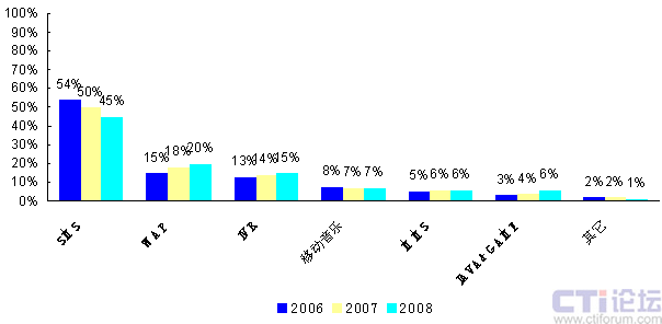 圖1 2006~2008年中國移動數據業(yè)務市場結構(單位:%)