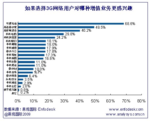 據(jù)易觀Enfodesk《中國(guó)3G市場(chǎng)用戶(hù)調(diào)研報(bào)告2009》研究發(fā)現(xiàn),可視電話成為最受用戶(hù)歡迎的增值業(yè)務(wù),除此之外,高速移動(dòng)寬帶業(yè)務(wù)和高清晰語(yǔ)音受用戶(hù)選擇比例也較高,分別達(dá)到49.5%和40.2%。與此相反的是,手機(jī)社區(qū)、手機(jī)博客和殺毒/安全業(yè)務(wù)受歡迎程度最小。
